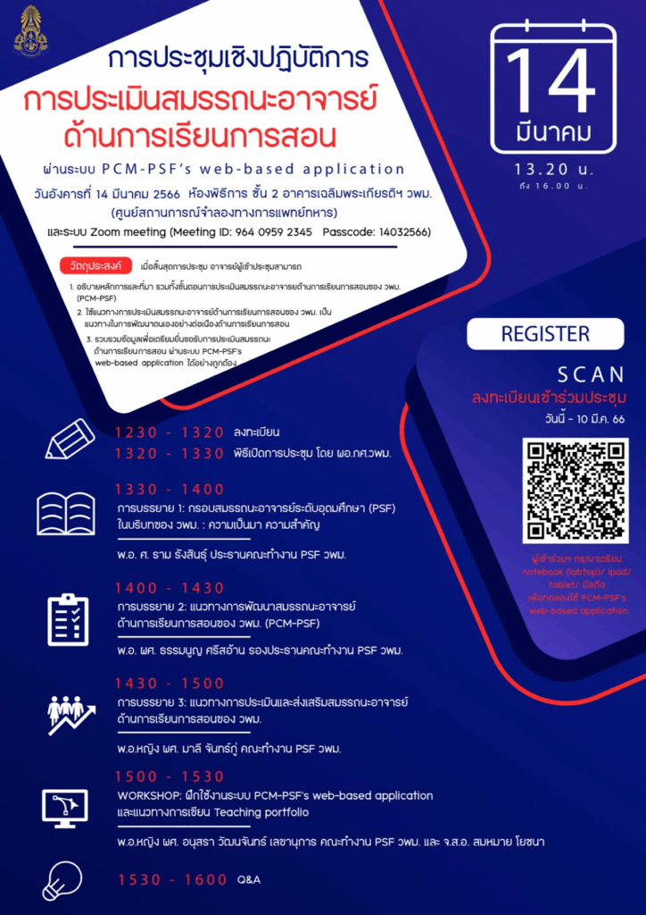 วันอังคารที่ 14 มีนาคม 2566 ณ ห้องประชุม ชั้น 4 อาคารเฉลิมพระเกียรติฯ วพม. (ศูนย์สถานการณ์จำลองทางการแพทย์ทหาร) และ ผ่านทางระบบ Zoom meeting