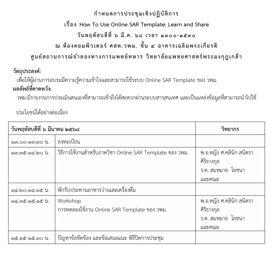 เมื่อเวลา 13.30 น. ของวันที่ 6 มีนาคม 2568 สปค.วพม. ได้จัดประชุมเชิงปฏิบัติการ เรื่อง How to Use Online SAR Template: Learn and Share วิทยากรของการประชุมฯ คือ พ.อ.หญิง ศ.คลินิก สนิตรา ศิริธางกุล และ ร.ต.สมหมาย โยชนา การประชุมฯ เรื่องนี้มีวัตถุประสงค์เพื่อให้ผู้เข้าประชุมซึ่งเป็นคณาจารย์และเจ้าหน้าที่ของภาควิชาทั้งปรีคลินิกและคลินิกมีความรู้ความเข้าใจและสามารถใช้ระบบ online SAR template ของวพม. ในการทำรายงานการประเมินตนเองของภาควิชาได้อย่างถูกต้อง สปค.วพม. ได้จัดการประชุมฯ เรื่องนี้ขึ้นเป็นประจำทุกปีเพื่อให้คณาจารย์และเจ้าหน้าที่ของภาควิชาที่ใช้งานระบบ online SAR template ของวพม. อยู่แล้วได้ทบทวนและมีความมั่นใจมากยิ่งขึ้นในการใช้ระบบนี้ นอกจากนี้ยังมีคณาจารย์และเจ้าหน้าที่ใหม่ที่ได้มาเรียนรู้การใช้งานและฝึกปฏิบัติจริง ผู้เข้าประชุมฯ สามารถสะท้อนคิดและให้ข้อมูลป้อนกลับแก่สปค.วพม. ทั้งปัญหาข้อขัดข้องและข้อเสนอแนะในการพัฒนาปรับปรุง online SAR template ของวพม. โดยมีผลลัพธ์ที่คาดหวัง คือ วพม. มีรายงานการประเมินตนเองที่สามารถเข้าถึงได้สะดวกผ่านระบบเทคโนโลยีสารสนเทศ และเป็นแหล่งข้อมูลที่สามารถนำไปใช้ประโยชน์ได้อย่างต่อเนื่อง